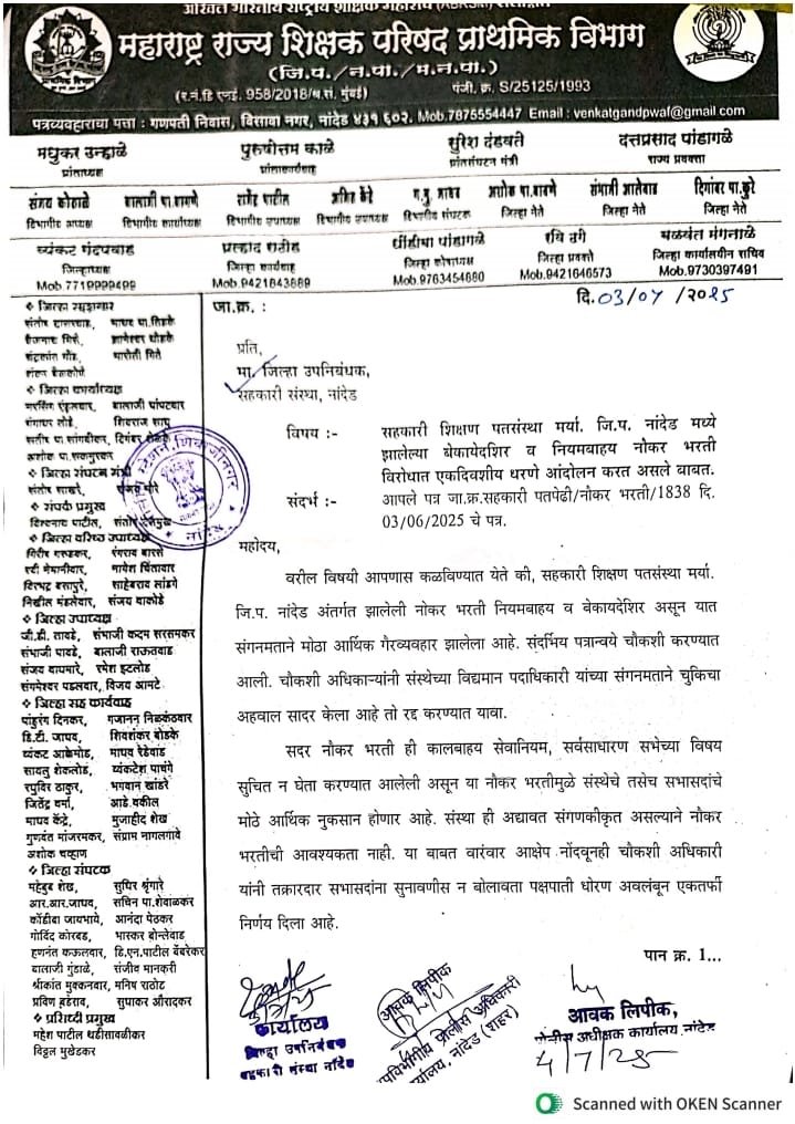 जिल्ह्यातील सहकारातील सर्वात मोठी शिक्षकांची असलेली पतसंस्था गेल्या दोन वर्षापासून सत्ताधारी संचालक मंडळाच्या अनागोंदी कारभारामुळे चर्चेत आली आह. या पतसंस्थेने वार्षिक सर्वसाधारण सभेत विषय न ठेवताच पतसंस्थेत बेकायदेशीररित्या नौकर भरती केल्याने सभासदांमध्ये मोठा तीव्र संताप निर्माण झालेला आहे. तसेच सहकार उपनिबंधक कार्यालयाकडून नियमबाह्य परवानगी मिळाल्यानंतर सात दिवसाच्या आत ही नोकर भरती कुठलीही प्रक्रिया राबवता सरळ नियुक्तीने भरती केली.या विरोधात एक दिवशीय धरणे आंदोलन शिक्षक परिषदेचे प्रांताध्यक्ष मधुकर उन्हाळे यांच्या नेतृत्वाखाली