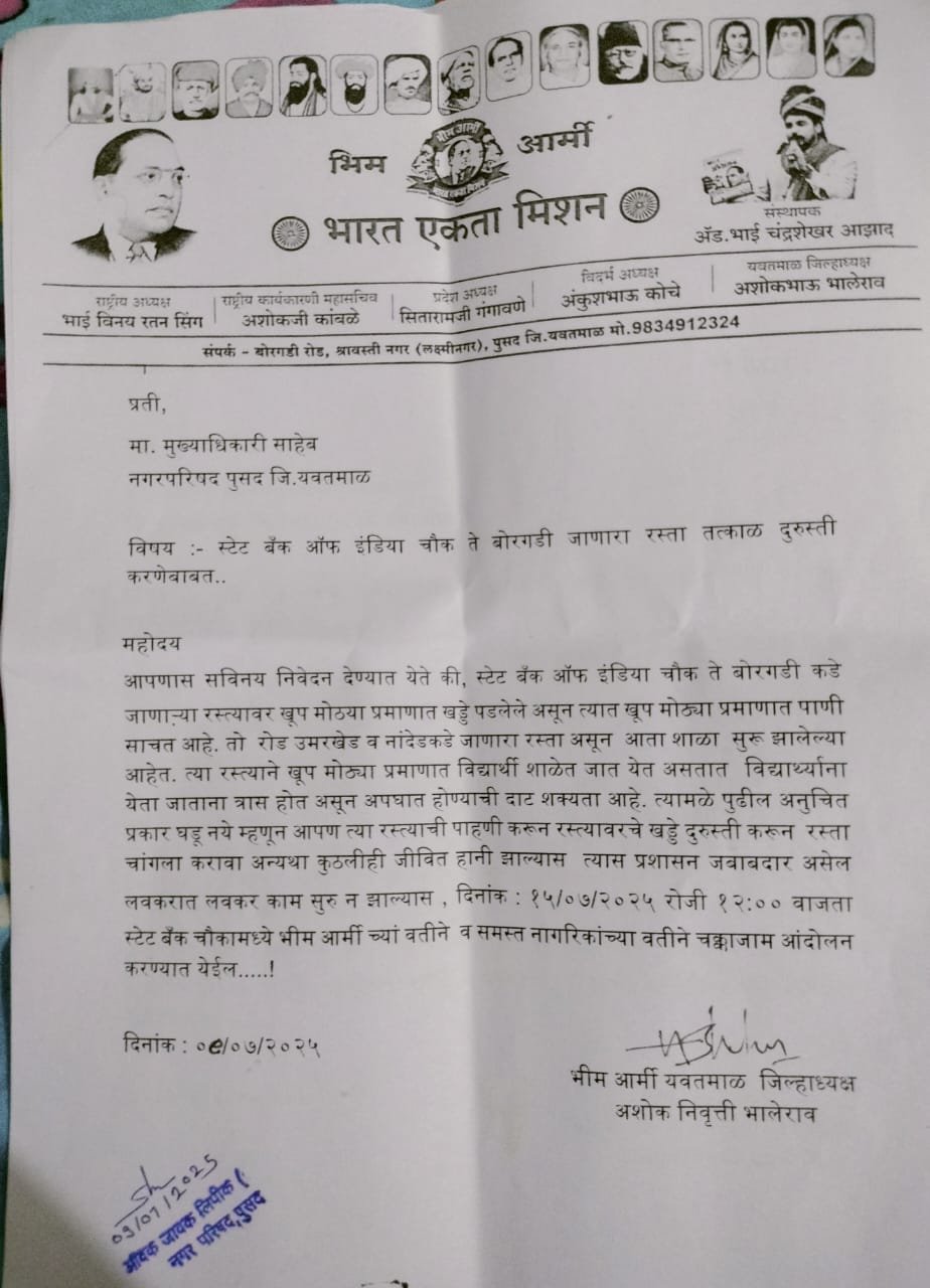 ही नगर परिषद प्रशासन यांना माहिती असून देखील प्रशासन या कडे दुर्लक्ष करीत आहे.या रस्त्यावर खड्डे पडले आहे,त्यात पाणी साचल्याने अनुचित प्रकार घडण्याची दाट शक्यता आहे.त्यामुळे या रस्त्यावर कोणतीही जीवितहानी झाल्यास त्यास सर्वस्व नगर परिषद प्रशासन जबाबदार राहील.या रस्त्याचे काम तात्काळ सुरू करून मजबूत असा रस्ता न बनवल्यास भीम आर्मी व समस्त नागरिकाच्या वतीने १५/०७/२०२५ रोजी स्टेट बँक ऑफ इंडिया चौक येथे चक्काजाम आंदोलन करेल.