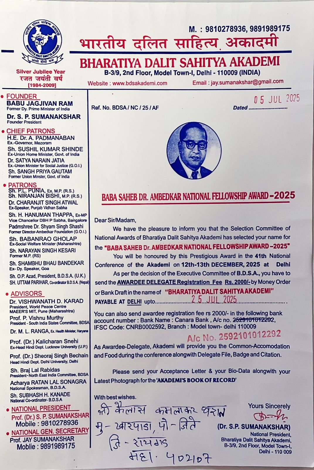 सामाजिक कार्यकर्ते पत्रकार कैलासराजे निर्मला कमलाकर घरत यांना अनेक राष्ट्रीय आणि राज्यस्तरीय पुरस्कार प्राप्त झाले असून त्यांची पुरस्कारांची मालिका अखंडपणे सुरूच आहे. सन्मानिय कैलासराजे घरत एक उत्तम निर्भिड पत्रकार असून जनसामान्यांच्या समस्यांना, अन्यायाला आपल्या लेखणीच्या पत्रकारितेच्या माध्यमातून वाचा फोडण्याचे, त्यांना न्याय मिळवून देण्यासाठी सतत प्रयत्नशील असतात. अपघात ग्रस्तांना उपचारासाठी मदत, शासकीय रुग्णालयात दाखल करण्यासाठी सहकार्य करणे असे कोणतेही क्षेत्र बाकी नाही. जिथे कमी तिथे आम्ही. त्यांचे कार्य हीच त्यांची ओळख बनली आहे. प्रत्येक क्षेत्रात आपल्या कार्याचा ठसा उमटवला आहे. त्यांच्यासारख्या एका कार्यकुशल, हरहुन्नरी, अष्टपैलू व्यक्तिमत्वास “डॉक्टर बाबासाहेब आंबेडकर नॅशनल फेलोशीप अवॉर्ड २०२५” जाहीर..