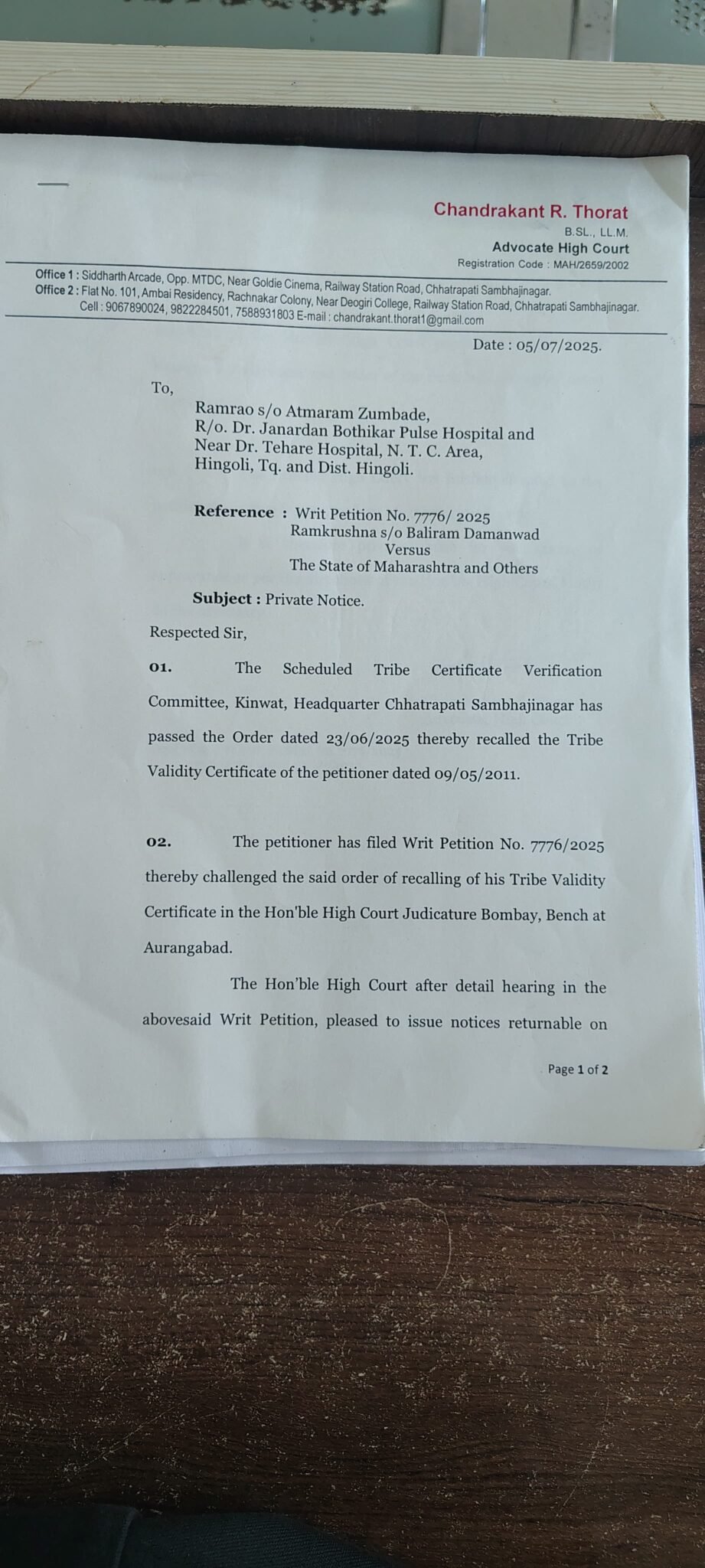 दिनांक 23/06/2025 रोजी अनुसूचित जमाती प्रमाणपत्र पडताळणी समिती, किंवत (मुख्यालय छत्रपती संभाजीनगर) यांनी रामकृष्ण बाळिराम दामनवाड यांचे दिनांक 09/05/2011 रोजी दिलेले जात वैधता प्रमाणपत्र रद्द करण्याचा आदेश दिला होता.