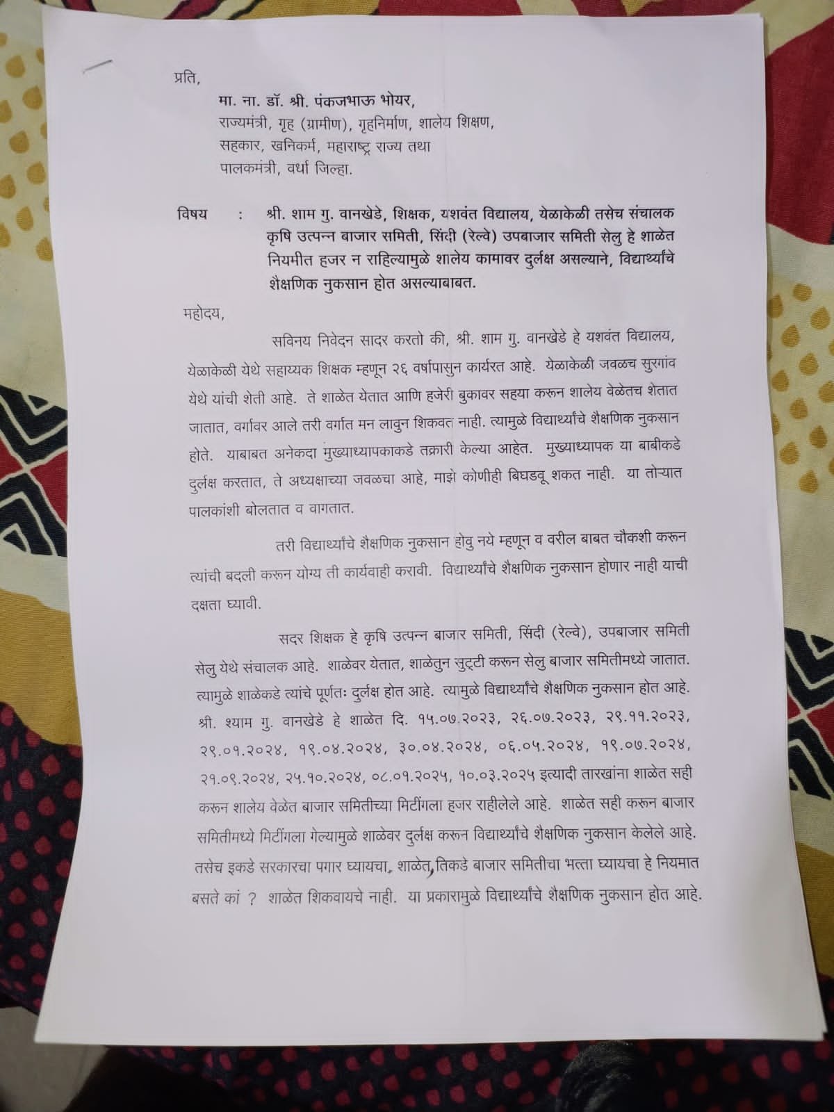 किंतु आज तक शिक्षक की दबंगगिरी के कारण कुछ नहीं हो पाया शिक्षक को शाला प्रबंधन ने जब जवाब पूछा तो उनका कहना है आपको जो करना है करे मेरा कुछ भी बिगड़ता नहीं ऐसी शिकायत का पत्र माजी ज़िला परिषद सदस्य शशांक घोड़मारे ने मंत्री व पालक मंत्री पंकज भोयर से लेखी की है और उसकी प्रतिलिपि ज़िला उपनिबंधक, शिक्षणाधिकारी और वरिष्ठ अधिकारियों को की है..