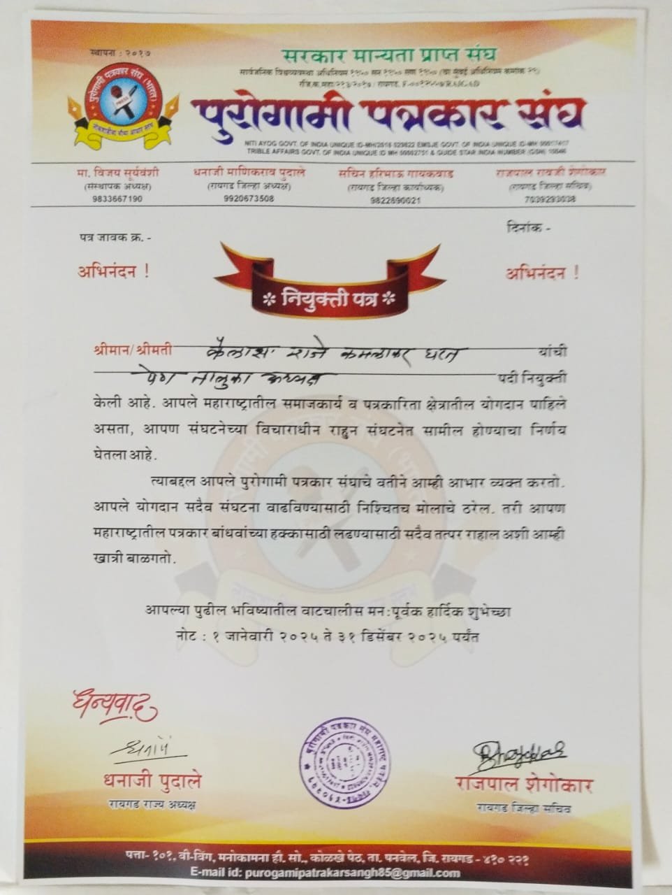 पत्रकार कैलासराजे निर्मला कमलाकर घरत यांच्या सामाजिक, शैक्षणिक आणि उत्कृष्ठ पत्रकारिता कार्याची दखल घेऊनच राष्ट्रीय पुरोगामी पत्रकार संघाच्या पेण तालुका अध्यक्षपदी निवड करण्यात आली आहे.