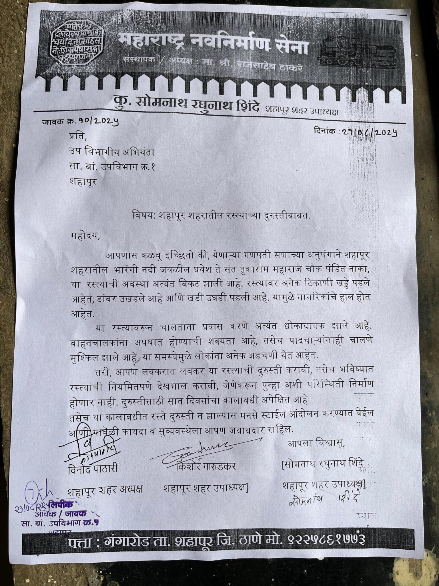 अतिवृष्टीमुळे शहापूर शहरात संपूर्ण रस्ते हे खड्डेमय झाले त्यामुळे वाहने तसेच लोकांना पायी चालताना कसरत करावी या संदर्भात मनसे शहापूर शहर उपाध्यक्ष सोमनाथ शिंदे यांनी सार्वजनिक बांधकाम विभाग यांना पत्र दिले आहे येणाऱ्या गणपती उत्सवाच्या निमित्ताने नागरिकांची गैरसोय होऊ नये शहापूर शहरात लवकरात लवकर खड्डे भरण्यात यावे असे पत्र सार्वजनिक बांधकाम यांना देण्यात आले
