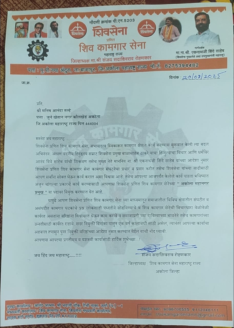 त्याबद्दल अभिनंदन आपण वंदनीय हिंदूहृदयसम्राट शिवसेनाप्रमुख बाळासाहेब ठाकरे यांचा हिंदुत्वाचा विचार आणि धर्मवीर आनंद दिघे साहेब यांची शिकवण तसेच मुख्य नेते मा.एकनाथरावजी शिंदे यांच्या आदेशानुसार शिवसेना प्रणित शिव कामगार सेना कामगार संघटनेचा प्रचार व प्रसार करीत तसेच शिवसेना यांच्या वाढीसाठी आपण सर्वांना सोबत घेऊन कार्य कराल असा विश्वास आहे तसेच आपल्या आजपर्यंत केलेले कार्य भविष्यात अजून चांगल्या प्रकारचे कार्य करण्यासाठी शिवसेना प्रणित शिव कामगार सेनाच्या अकोला महानगर प्रमुख मनिष रुल्हे यांची या पदावर नियुक्ती करण्यात आली.