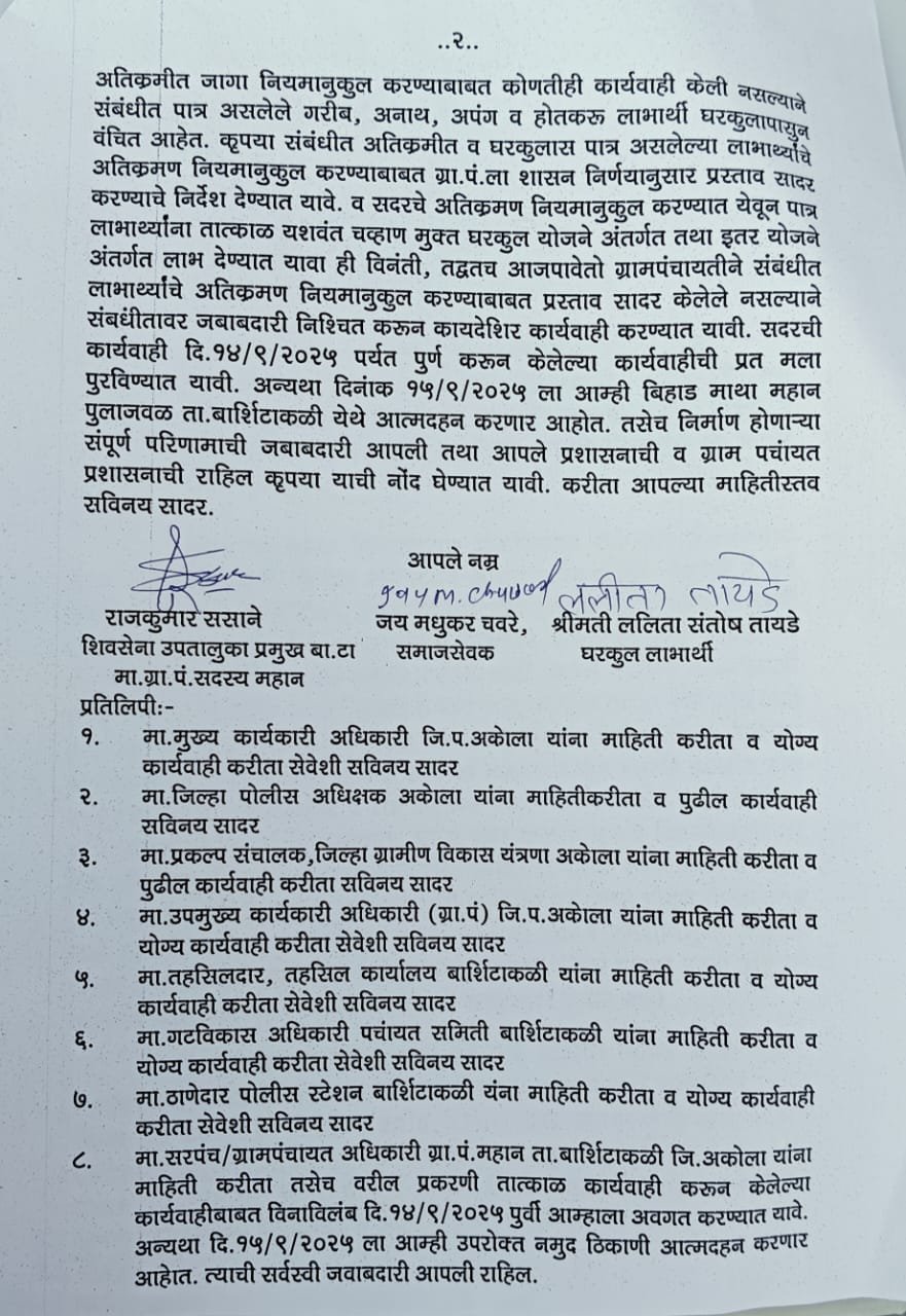 सदस्यांची संबंधीत जबाबदारी निश्चित करून कार्यवाही करावी. कार्यवाही दिनांक १४/८/२०२४ पूर्वी पुर्ण करण्यात यावी. अन्यथा दिनांक १५/८/२०२४ रोजी आम्ही विहीर माच्या महान पुलाजवळ ता. बारशिटाकळी येथे आत्मदहन करणार आहोत.