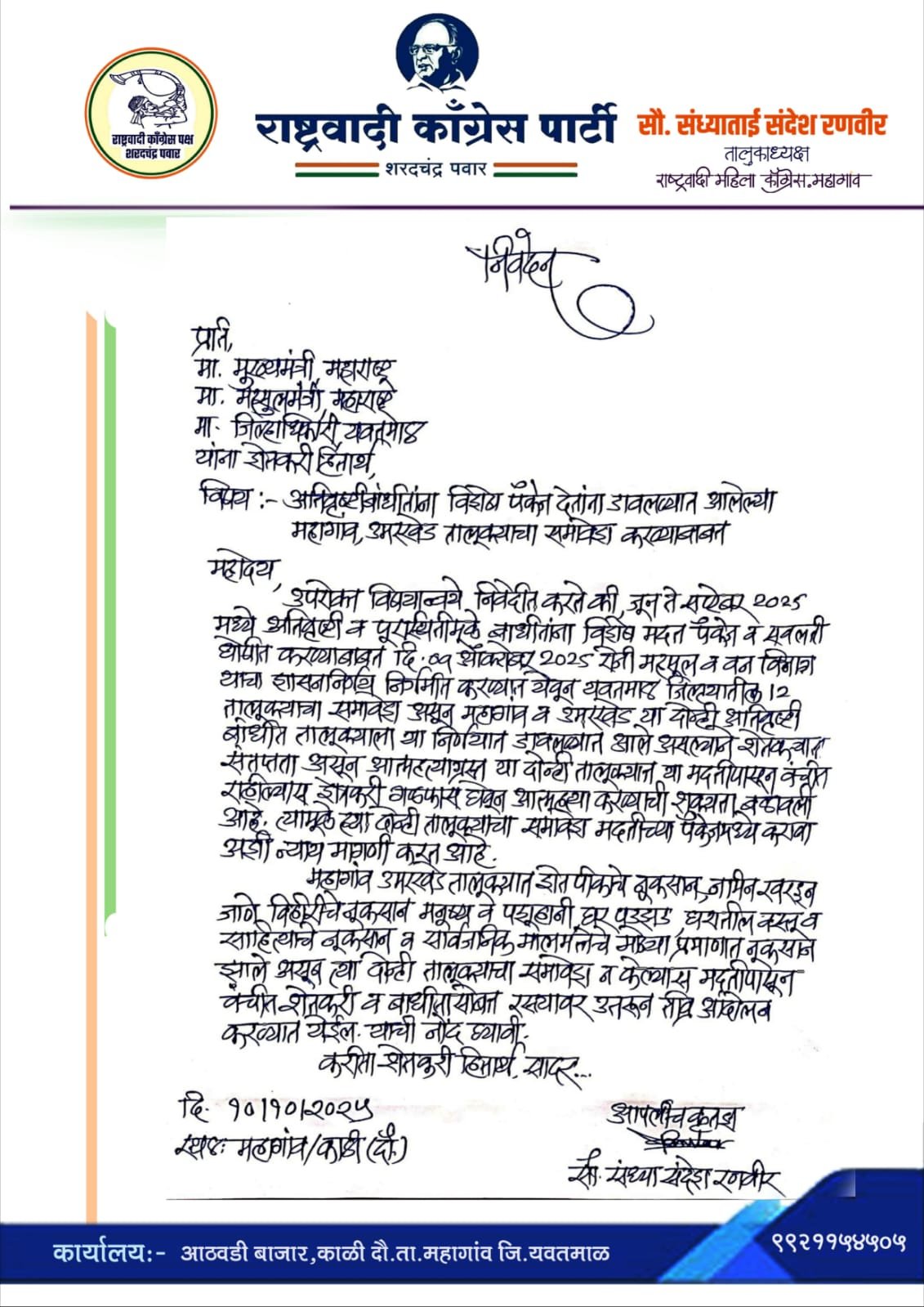 राज्यात जून ते सप्टेंबर 2025 मध्ये अतिवृष्टी व पूर आपत्तीमुळे बाधिताना विशेष मदत पॅकेज व सवलती घोषित करण्याबाबत दिनांक 9 ऑक्टोंबर 2025 ला निघालेल्या महसूल व वन विभाग यांच्या शासन निर्णयांमध्ये यवतमाळ जिल्ह्यातील बारा तालुक्याचा समावेश करून जास्त प्रमाणात नुकसान झालेल्या महागाव व उमरखेड या दोन्ही तालुक्याला डावळल्याने शेतकऱ्यांना आत्महत्येची पाळी येणार असल्याने संतप्त प्रतिक्रिया शेतकऱ्यांच्या उमटत असून या दोन्ही तालुक्याचा समावे्श या शासन निर्णयात करण्यात यावा अशी मागणी सौ संध्या संदेश रणवीर तालुकाध्यक्ष राष्ट्रवादी महिला काँग्रेस शरदचंद्र पवार महागाव तालुका यांनी मुख्यमंत्री महसूल मंत्री व जिल्हाधिकारी यांना पाठवलेल्या निवेदनातून केली आहे
