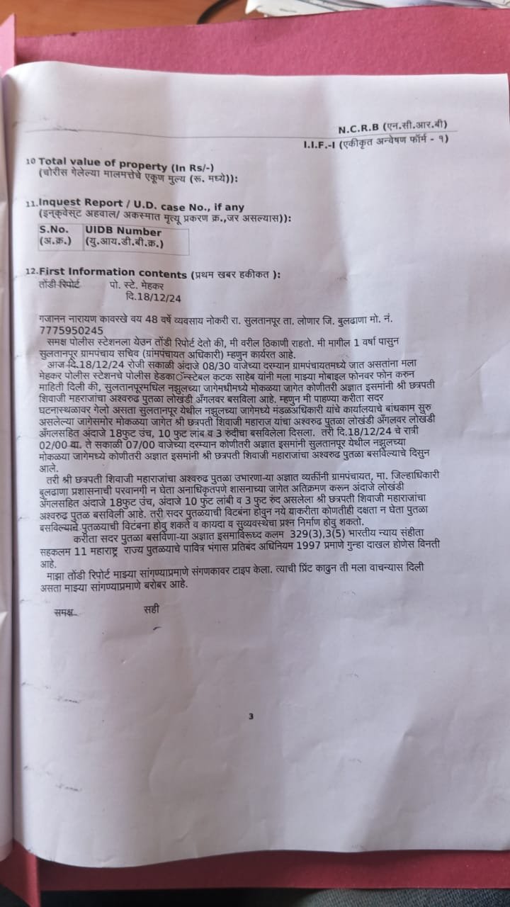 बुलढाणा जिल्हा प्रतिनिधी :-सुनिल वर्मा लोणार -तालुक्यातील सुलतानपूर येथे दिनांक 17 डिसेंबरच्या आत मध्यरात्री श्री छत्रपती शिवाजी महाराज यांचा पुतळा अज्ञात व्यक्तीने उभारण्यात आला याबाबत ग्रामपंचायत ग्रामविकास अधिकारी गजानन कावरखे यांनी पोलीस स्टेशनला तक्रार दिली असून पोलिसांनी अज्ञात व्यक्तीविरुद्ध गुन्हा दाखल केला आहे याबाबत अधिक माहिती अशी की सुलतानपूर येथे दिनांक 17 डिसेंबरच्या मध्यरात्री बस स्टॅन्ड वर नव्याने सुरू असलेल्या तलाठी , मंडळ अधिकारी कार्यालय कार्यालयासमोर श्री छत्रपती शिवाजी महाराज यांचा पुतळा उभारण्यात आला सदर घटना दिनांक 18 डिसेंबरच्या सकाळी उघडकीस आल्याने सकाळी सर्व नागरिकांनी पुतळ्याकडे धाव घेतली.