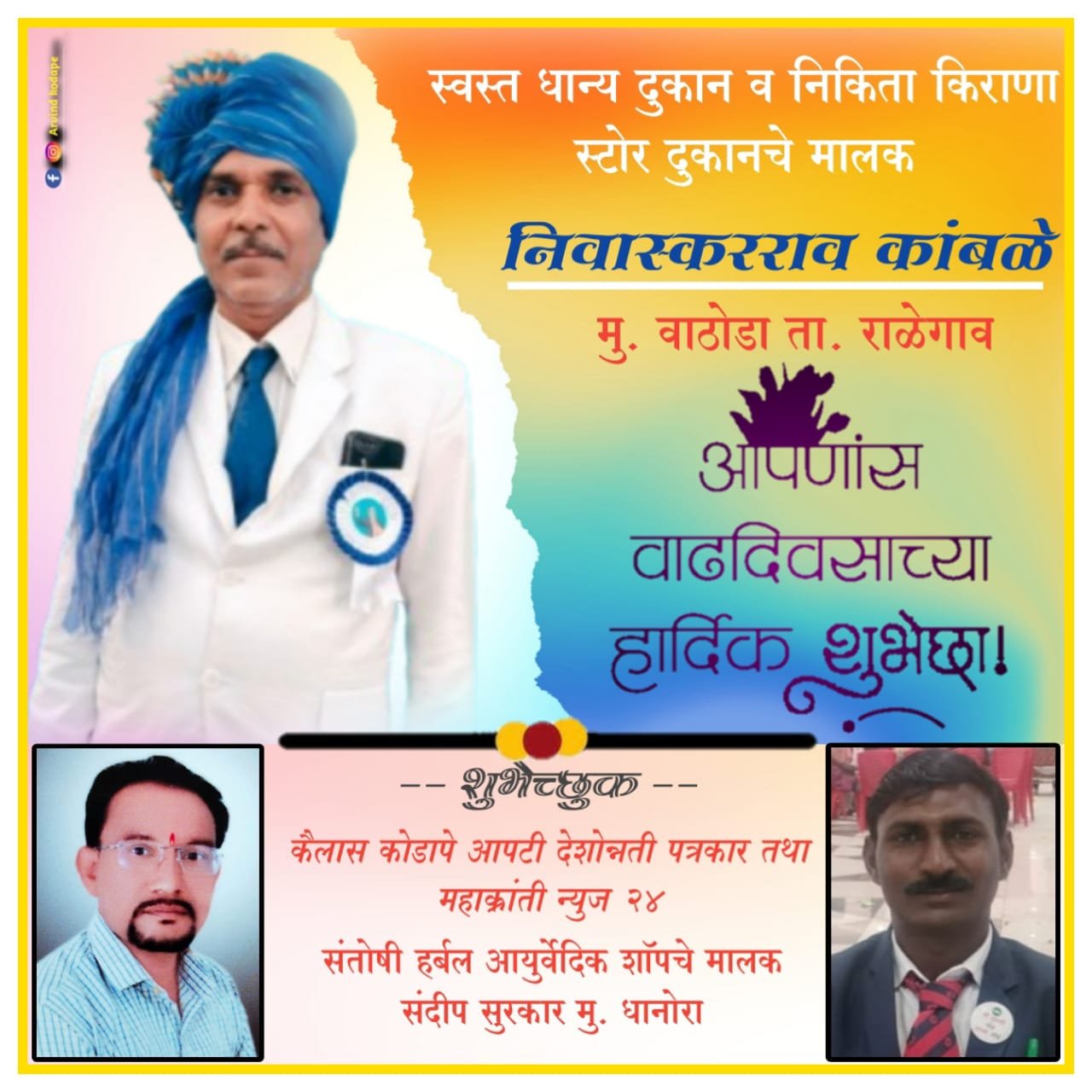 मु.पोस्ट वाठोडा,ता राळेगाव येईल स्वस्त धान्य दुकान व निकिता किराणा स्टोर चे मालक निवास्कररावं कांबळे यांना वाढदिवसाच्या हार्दिक शुभेच्छा. ..