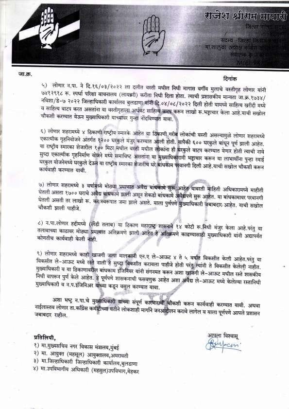 परंतु अशा ठिकाणी नगरपालिकेने शासनाच्या निधीतून रस्त्याची कामे केलेली आहेत ही कामे करताना मुख्य अधिकारी व संबंधित अभियंत्यांनी शासनाची दिशाभूल करून शासनाचे कोट्यवधी रुपयांचे नुकसान केले आहे संबंधित रक्कम मुख्याधिकारी व इंजिनियर यांच्याकडून वसूल करण्यात येऊन त्यांच्यावर गुन्हे दाखल करण्यात यावे या सर्व भ्रष्टाचाराला नियमबाह्य काम करण्याला प्रशासक मुख्याधिकारी जबाबदार असून त्यांच्यावर कारवाई करण्यात यावी अन्यथा काँग्रेस पक्षाच्यावतीने तीव्र जन आंदोलन करण्यात येईल असा इशारा राजेश मापारी यांनी उपमुख्यमंत्री यांना दिलेल्या निवेदनातून दिला आहे.