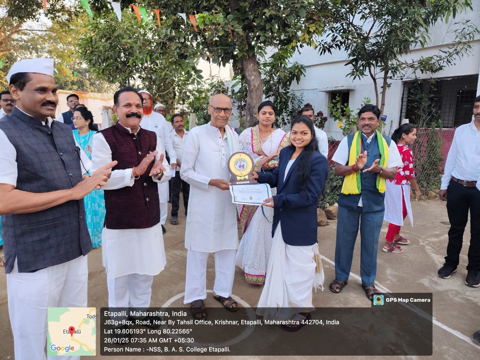 ध्वजारोहणाचे संचालन शारीरिक शिक्षण विभाग प्रमुख प्रा. डाॅ. संदीप मैंद यांनी केले. याप्रसंगी गोंडवाना विद्यापीठ गडचिरोली आंतरमहाविद्यालयीन व्हाॅलीबाल स्पर्धेत अजिंक्यपद पटकाविलेल्या चमूतील महाविद्यालयाचे खेळाडू अक्षय गोटा व यश झाडे यांचे आंतर विद्यापीठ वेस्ट झोन व्हाॅलीबाल स्पर्धेसाठी निवड झाल्याबद्दल तसेच आल इंडिया आंतर विद्यापीठ युथ फेस्टिवल वेस्ट झोन मध्ये निवड झालेल्या कु. रोशनी कंगाली, कु.विना गावडे व सचिन गावडे यांचे प्रमाणपत्र व स्मृतिचिन्ह देऊन मान्यवरांच्या हस्ते सत्कार करण्यात आला.