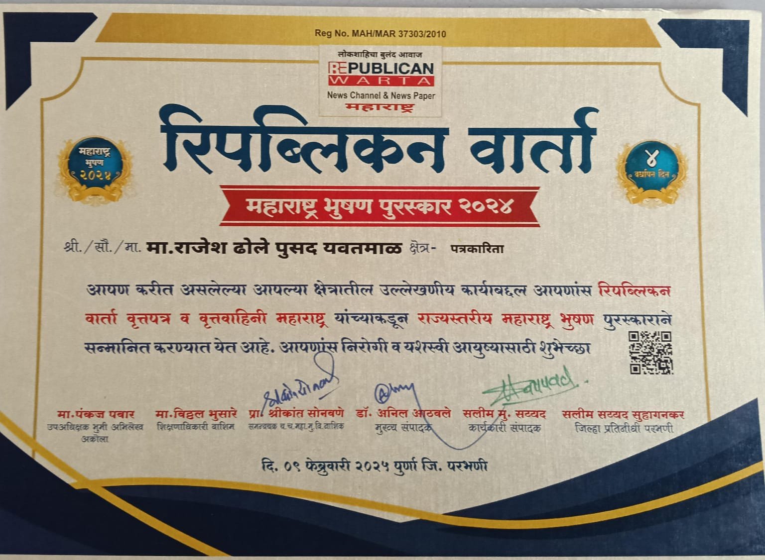 रिपब्लिकन वार्ताच्या चौथ्या वर्धापन दिनानिमित डॉ. झाकीर हुसेन सभागृह इक्बाल नगर पूर्णा जिल्हा परभणी येथे झालेल्या कार्यक्रमात रिपब्लिकन वार्ता समूहाचे विदर्भ विभाग उपसंपादक राजेश ढोले यांना राजकीय,पत्रकार, तसेच सामाजिक योगदाना बद्दल व उल्लेखनीय कामगिरी केल्याबद्दल राज्यस्तरीय, महाराष्ट्र भूषण पुरस्कार सन्मान चिन्ह व पुष्पगुच्छ देऊन गौरवविण्यात आले.