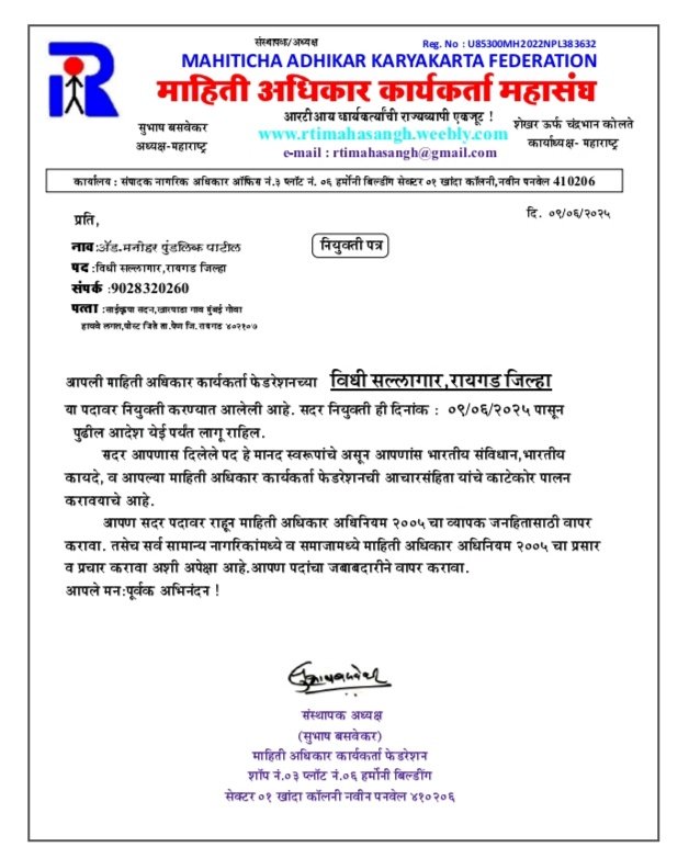 संस्थापक अध्यक्ष श्री सुभाष बसवेकर यांच्या आदेशाने ज्येष्ठ विधीज्ञ ॲडव्होकेट मनोहर पाटील साहेब यांची माहिती अधिकार कार्यकर्ता महासंघाच्या(फेडरेशन)