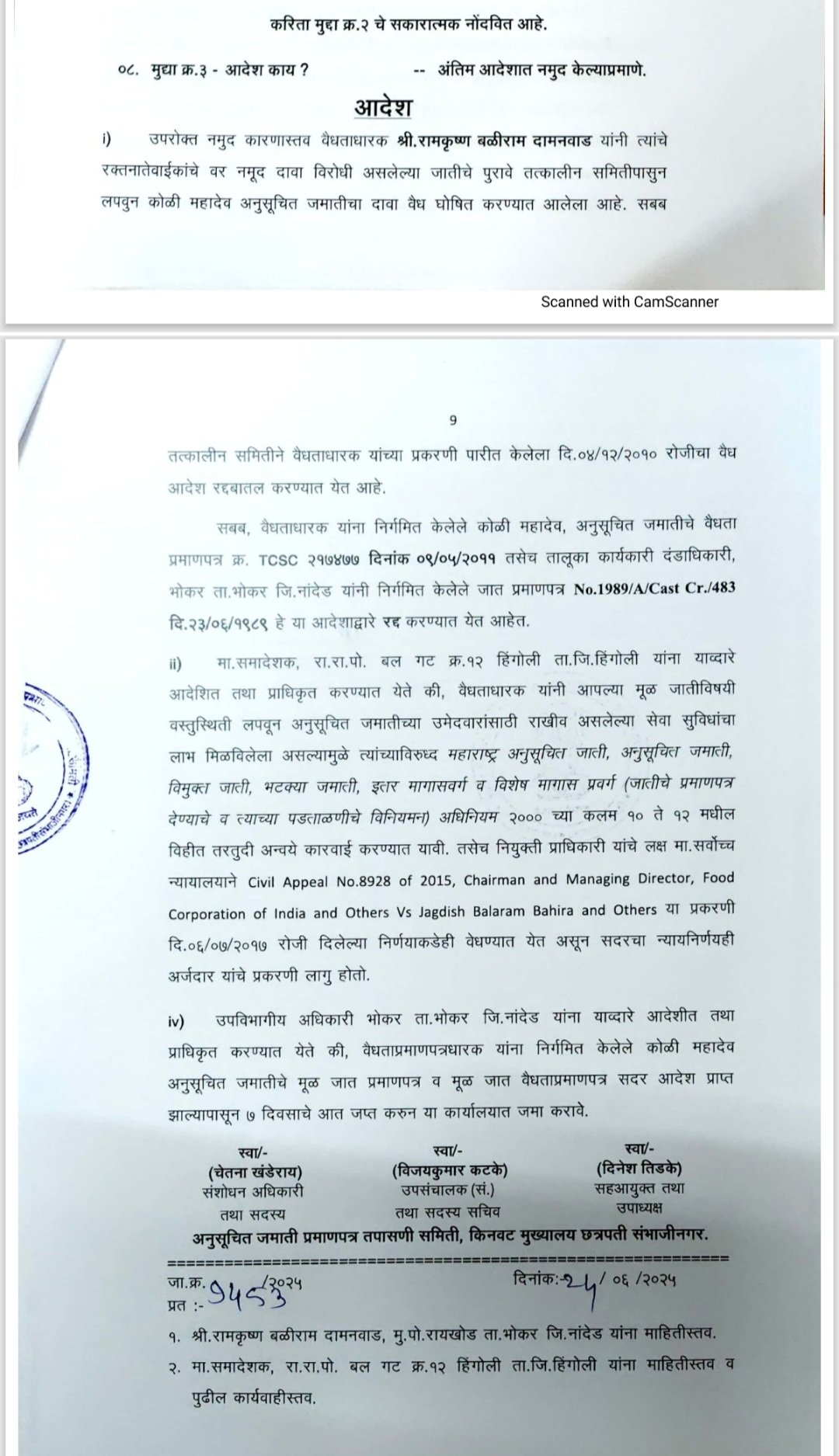 प्रमाणपत्र जप्ती: उपविभागीय अधिकारी, भोकर, यांना श्री. दामनवाड यांचे मूळ जात प्रमाणपत्र आणि वैधता प्रमाणपत्र ७ दिवसांच्या आत जप्त करून कार्यालयात जमा करण्याचे आदेश देण्यात आले आहेत.