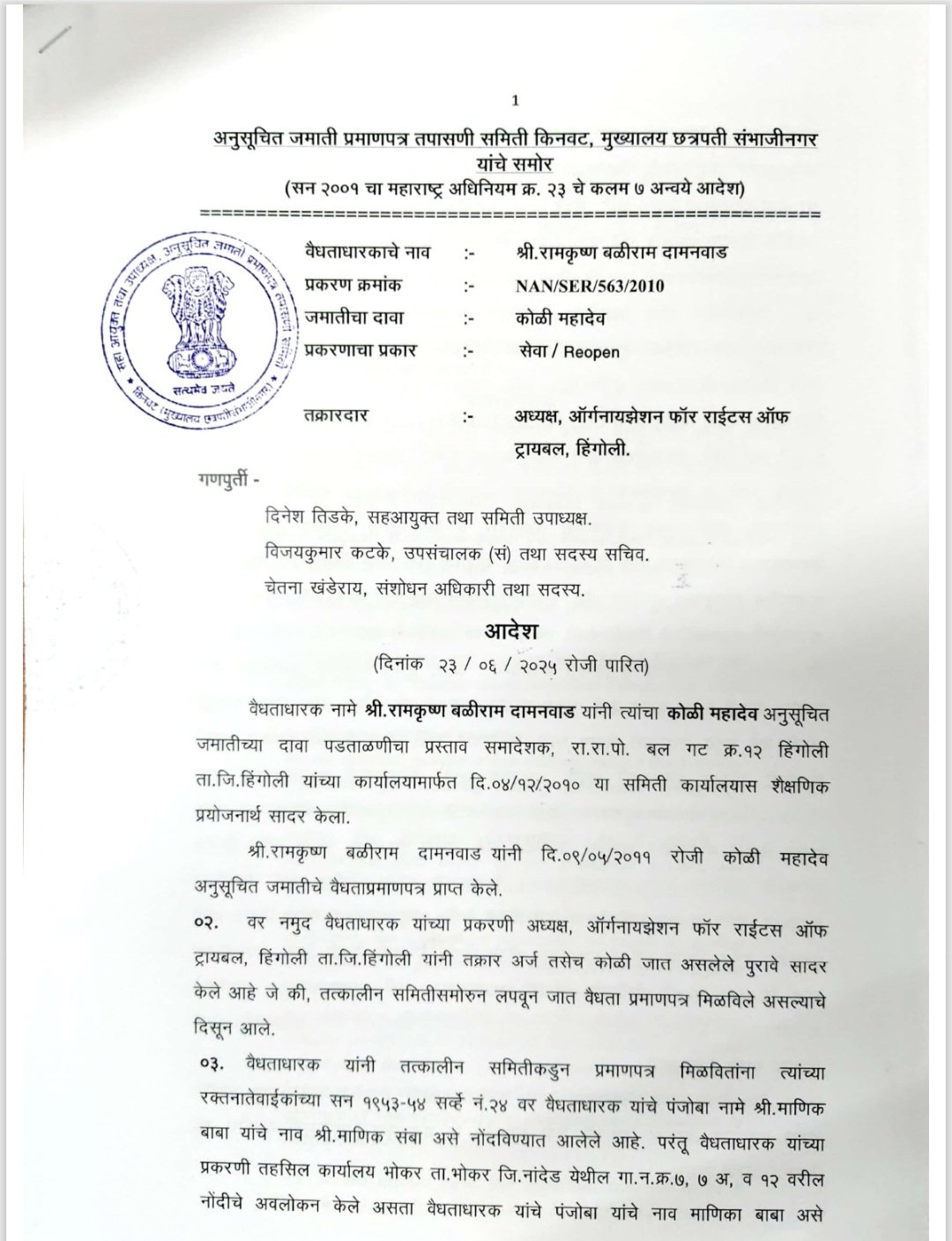 ऑर्गनायझेशन फॉर राइट्स ऑफ ट्रायबल, हिंगोलीच्या तक्रारीवर समितीचा महत्त्वपूर्ण निर्णय;